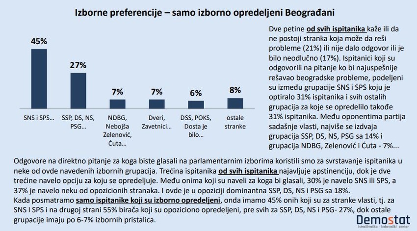 U teoriji, to jest prema Demostatu, vladajuća koalicija je skoro izjednačena sa opozicijom u Beogradu. Za SNS i SPS se predviđa 45 odsto glasova, a za nominalnu opoziciju čak 47 odsto: grupaciji stranaka SSP, DS, NS i PSG 27 odsto, za Ne davimo Beograd i njime pridružene zelene pokrete i stranke 7 odsto, za Dveri i Zavetnike takođe 7, dok bi DSS, POKS i DJB navodno osvojili ukupno 6 odsto.
