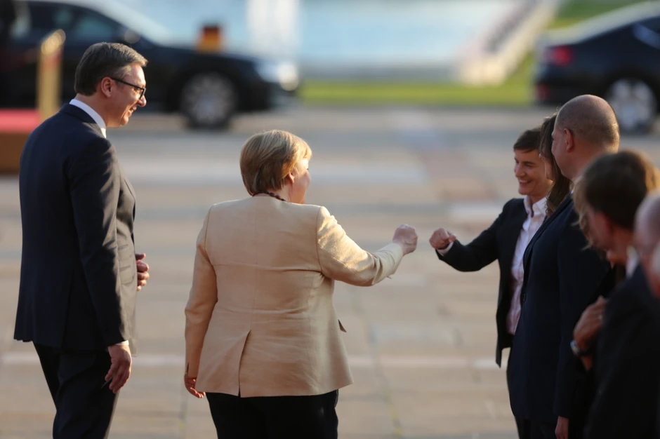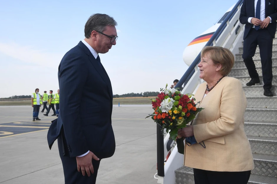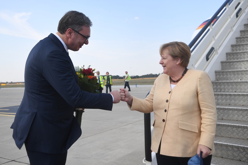 Po sletanju, Vučić i Merkel su se pozdravili pesnicama, u skladu sa epidemiološkim merama. Na dočeku je bio i ambasador Nemačke u Srbiji Tomas Šib.