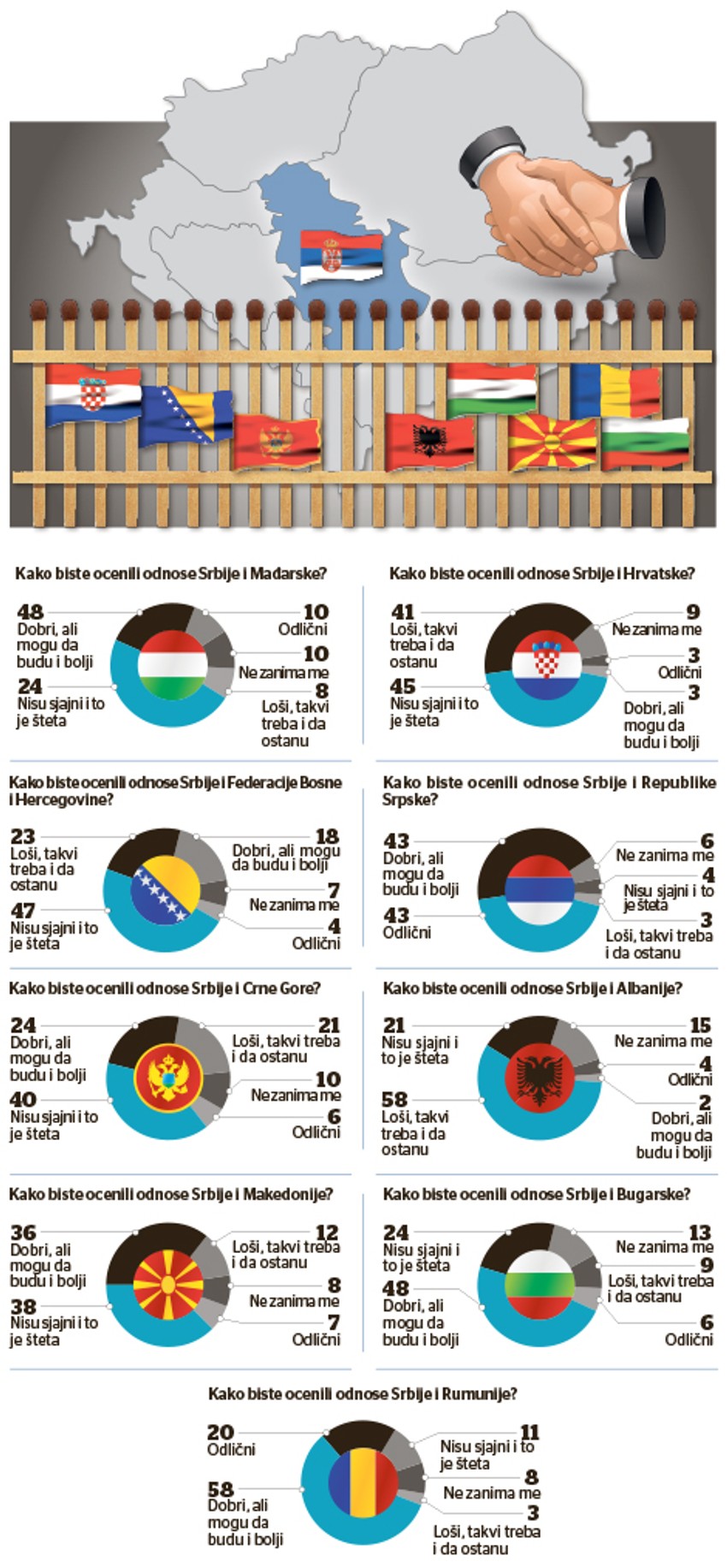 Odlične relacije sa ostalim zemljama ispitanici prepoznaju u tek ponekom procentu: sa Makedonijom sedam odsto, sa Crnom Gorom i Bugarskom šest, sa Albanijom i BiH četiri i sa Hrvatskom tri.