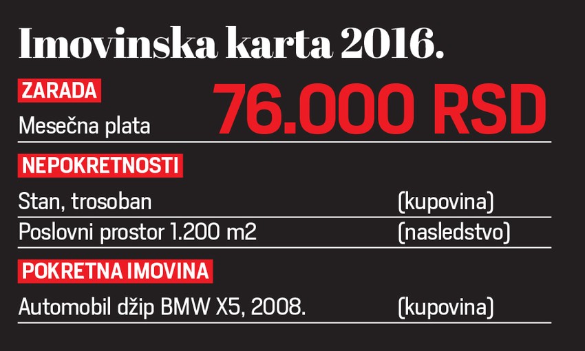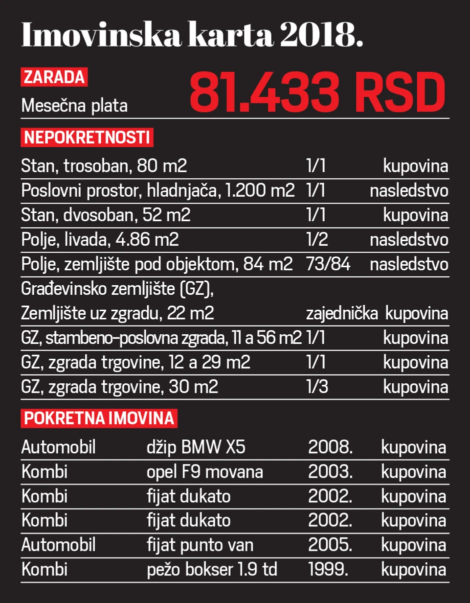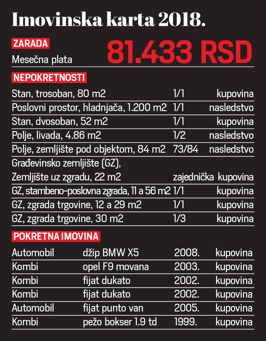 - Nije prijavio više nepokretnosti u Brusu - zemljište površine 3.781 kvadrat, pomoćne objekte površine 35 kvadrata i 84 kvadrata, stambeno-poslovnu zgradu površine 521 metar kvadratni, kao i objekte trgovine od 30 kvadrata - stoji u krivičnoj prijavi.