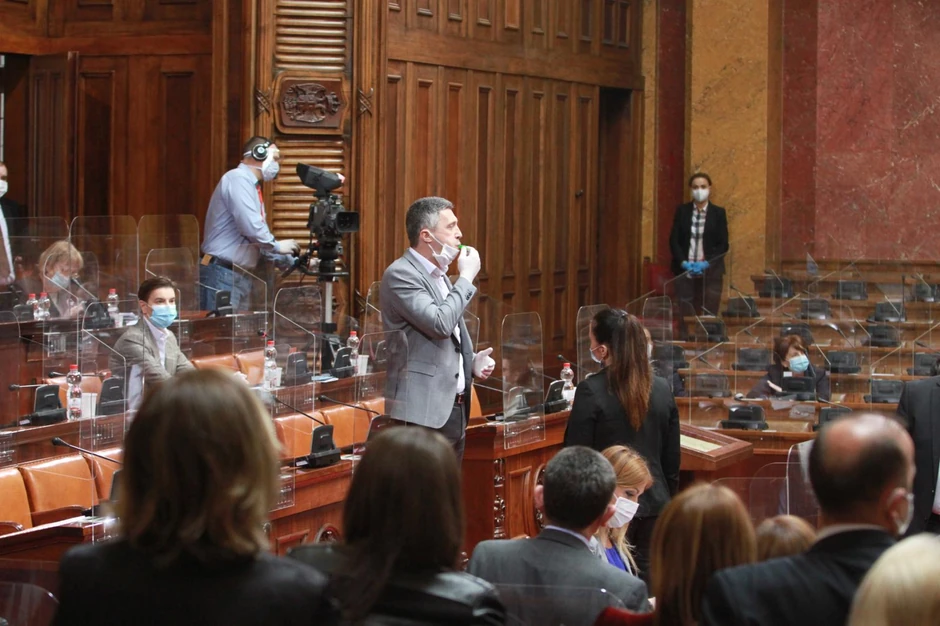 Međutim, tome su prethodile dve pauze, rasprava sa poslanicima, ali i sa obezbeđenjem, koje je na kraju, po nalogu predsednice parlamenta Maje Gojković, reagovalo i fizički ga izvelo sa sednice.