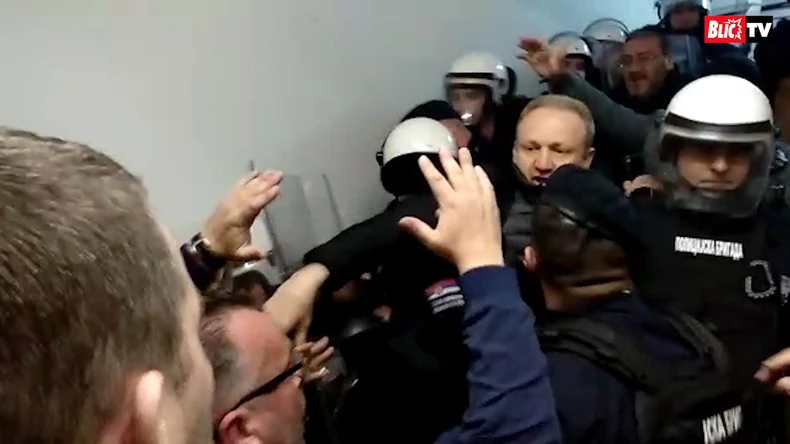 Lider Dveri Boško Obradović, jedna od organizatorki protesta "1 od 5 miliona" Jelena Anasonović i grupa građana upali su večeras na silu u zgradu RTS, tražeći da gostuju u Dnevniku 2. Na lice mesta je stigla i policija, a nije bilo incidenata. Policijski komandant je u razgovoru sa Draganom Đilasom i Obradovićem tražio da napuste zgradu RTS, što su oni odbili.