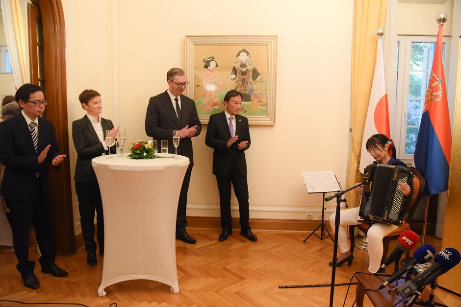 U rezidenciji ambasadora Japana u Srbiji Kacamuta Takahika, večeras je održan prijem povodom obeležavanja 140 godina uspostavljanja prijateljskih odnosa dve zemlje, kojem su prisustvovali predsednik i premijerka Srbije, Aleksandar Vučić i Ana Brnabić.