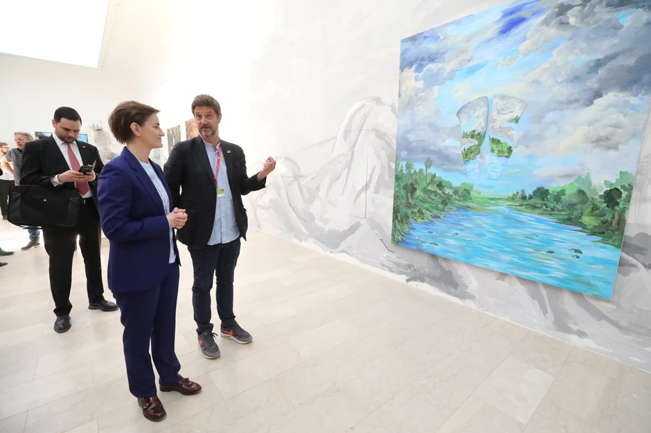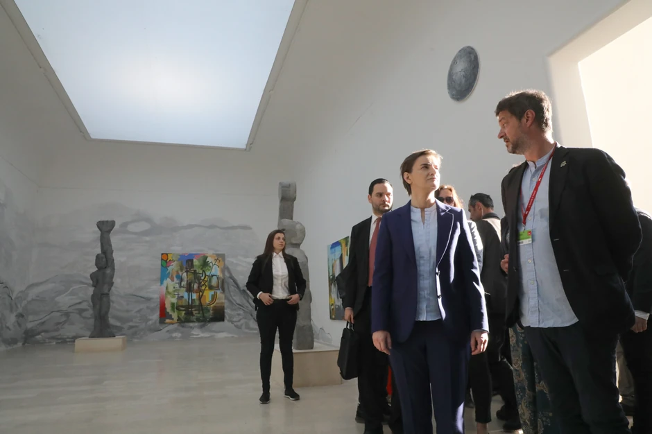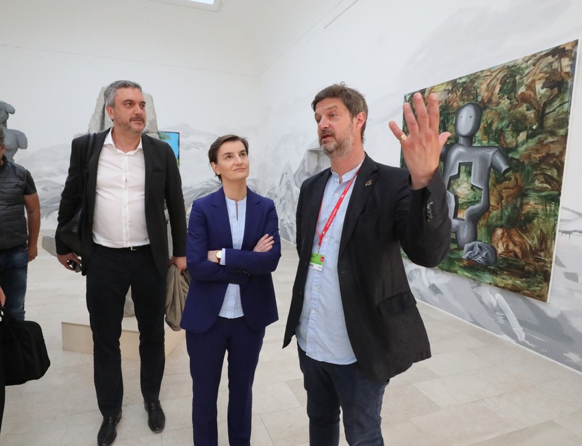 "Stvara ideje, inovacije, tehnologiju, prelepu umetnost, muziku, film", rekla je Brnabić, koju je lično dočekao i proveo kroz postavku umetnički direktor Bijenala Ralf Rugof.