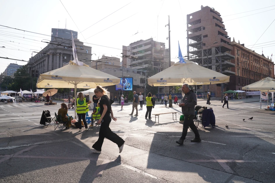 Manja grupa okupljenih i večeras blokira raskrsnicu ulica Kneza Miloša i Nemanjine, jednu od najprometnijih u Beogradu. Okupljeni se trenutno nalaze van šatora, igraju odbojku, badminton i šah, a sa razglasa se pušta muzika.