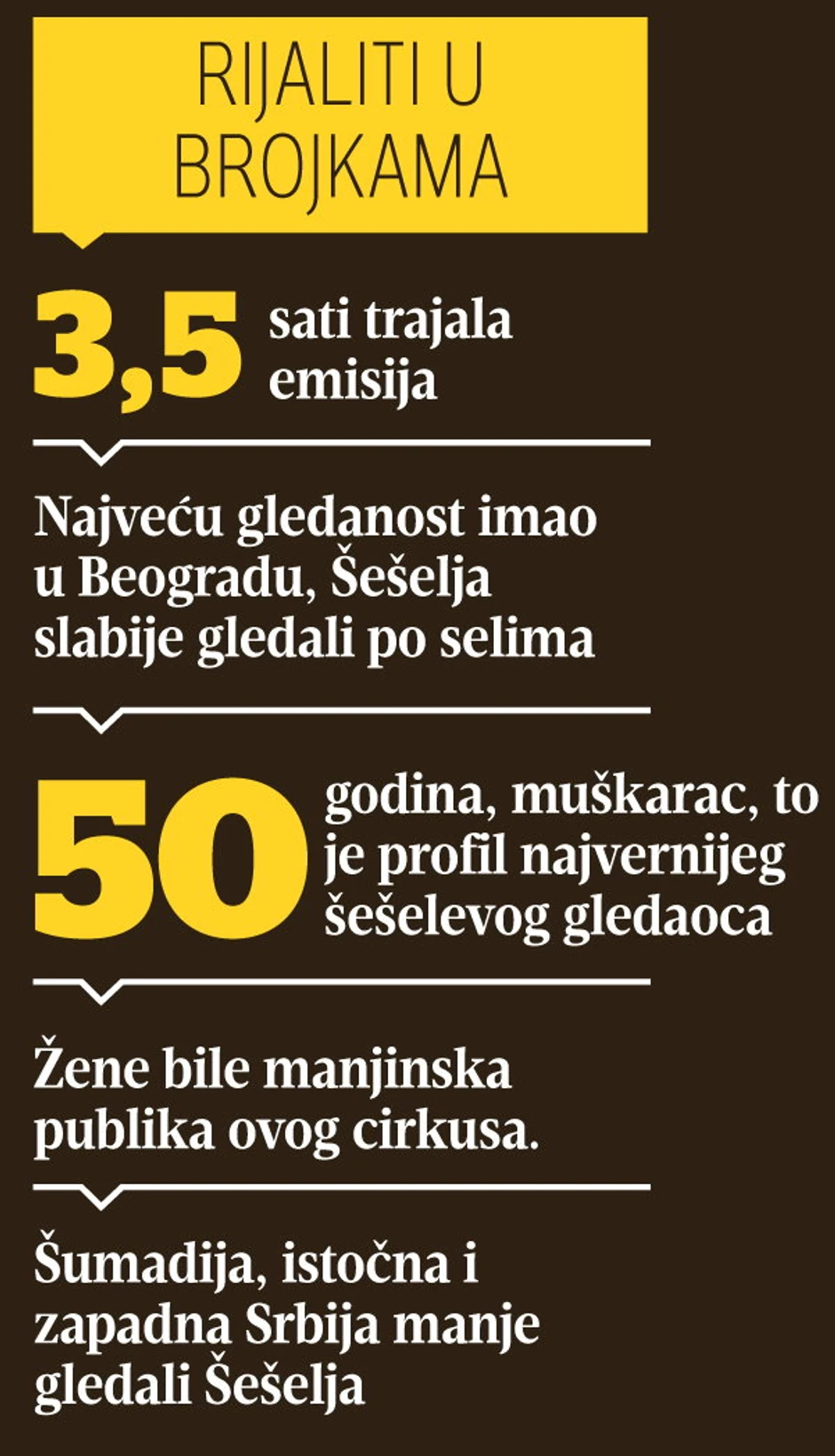 Iako će mnogi pomisliti da su Šešelja najviše gledali u ruralnim delovima Srbije, stvarnost je drugačija i upozoravajuća - u Beogradu je Šešeljev rijaliti bio najgledanija emisija! Njegova najvernija publika bili su muškarci preko 50 godina.