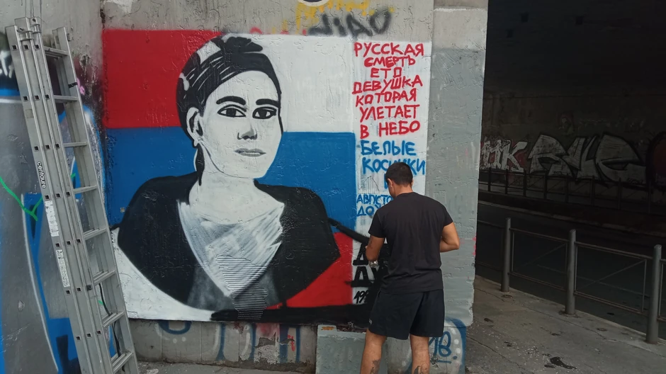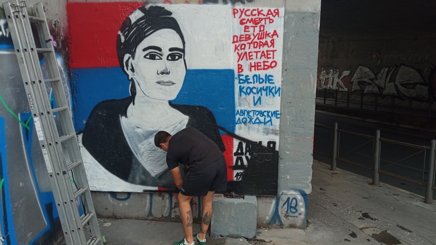 Pored lika Duginove, na ruskom je ispisana i poruka: "Ruska smrt devojke koja je poletela u nebo bele kose i avgustovske kiše“.