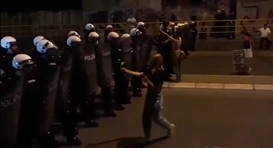 Jedna devojka je uzela mikrofon u ruke i obratila im se, da bi odmah posle toga demonstranti mahom prilazili kordonu i davali im cvetove od papira, dok je jedan mladić ispred njih stavio zastavu.