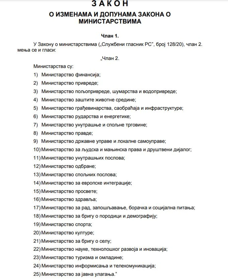 Kako stoji u predlogu koji je upućen u Skupštinu Srbije, nova Vlada Srbije imaće četiri nova ministarstva, a njihov ukupan broj biće 25.