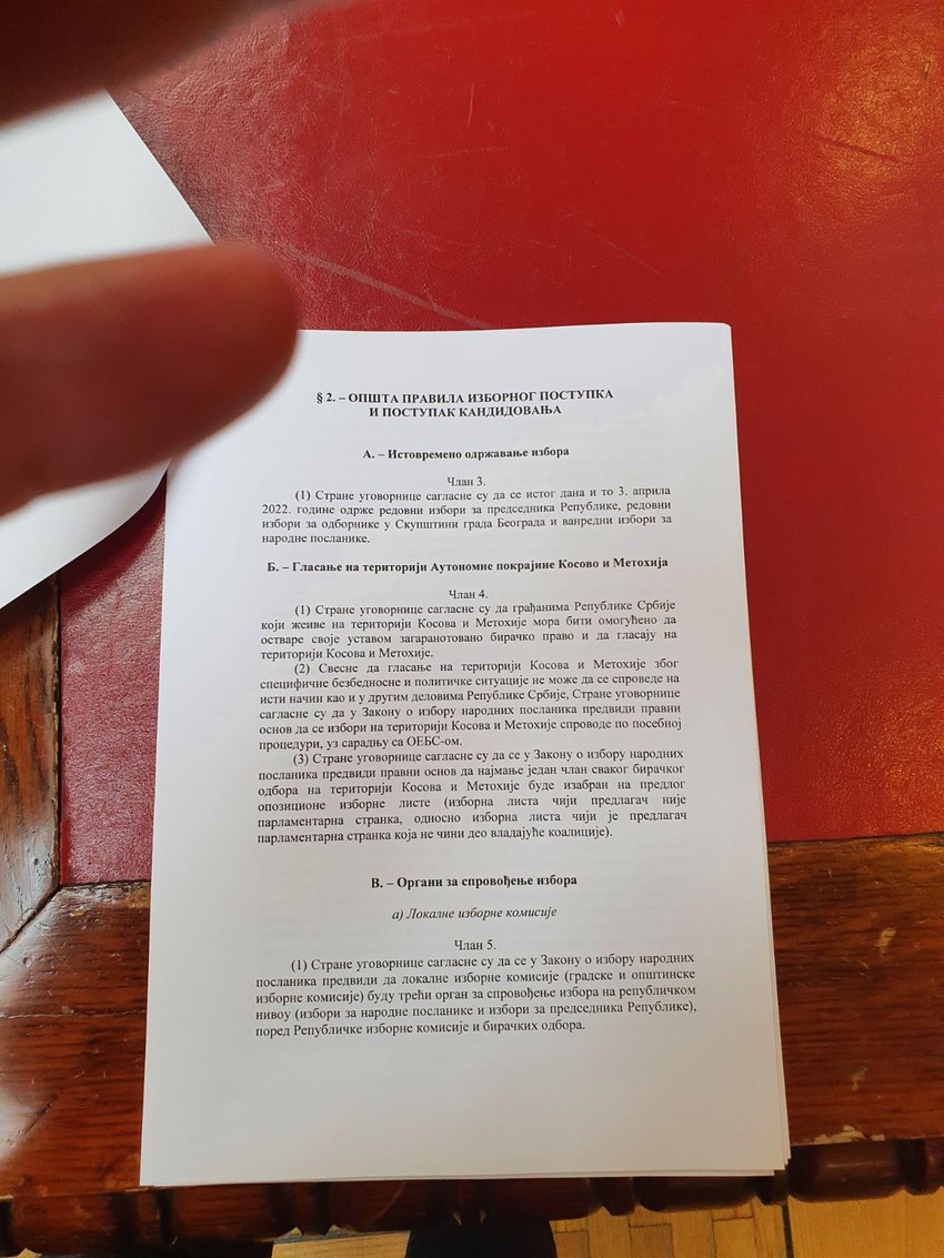 - Svesni da glasanje na teritoriji KiM zbog specifične bezbednosne situacije ne može da se sprovede na isti nalin kao i u drugim delovima Srbije, strane ugovornice saglasne su da da se izbori na KiM sprovode po posebnoj proceduri, uz saradnju sa OEBS-om - navodi se u predlogu sporazuma.