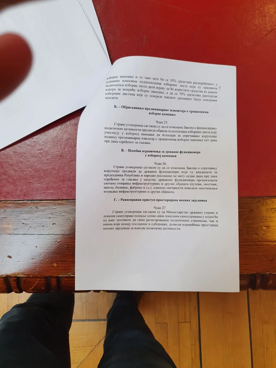 Predlog Sporazuma, u koji je "Blic" imao uvid, ima 11 strana, a određuje opšta pravila izbornih uslova, kao i postupak kandidovanja. Podložan je, kako priča izvor Blica, izvesnim promenama, a očekuje se opozicija kaže svoje do 11. septembra, za kada je planirano potpisivanje.