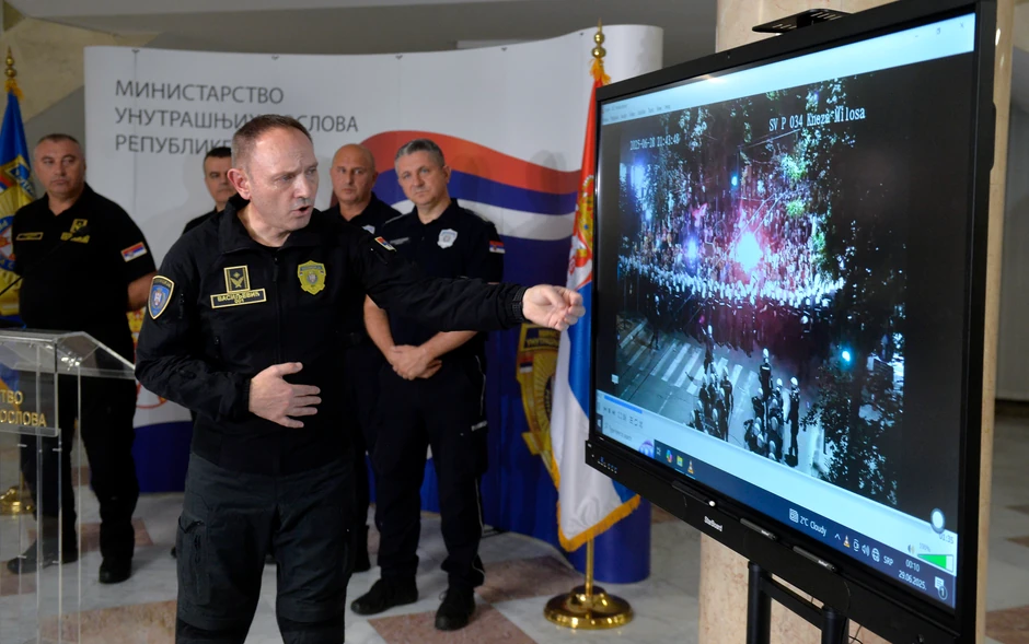 - Da bi oni koji napadaju policiju, koji napadaju državu, u tome bili onemogućeni. Pustiću samo jedan kratak snimak da vidite kako je započela cela ta aktivnost. Ja ovom prilikom odajem priznanje svim pripadnicima Ministarstva unutrašnjih poslova i Direkcije policije, našoj žandarmeriji, interventnim jedinicama policije, policijskoj brigadi, pripadnicima Uprave i kriminalističke policije, pripadnicima odeljenja za javni red i mir i Uprave i kriminalističke policije, Policijske uprave za grad, Beograd, na savesnom radu i zalaganju - rekao je direktor policije.