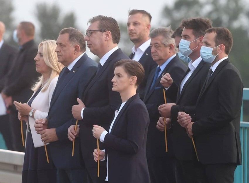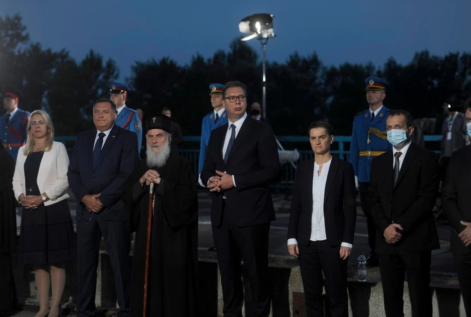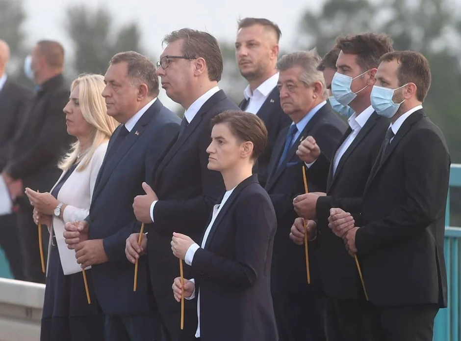 Simbllično, Vučić i Brnabić sreli su se sa Dodikom i Cvijanović na pola mosta u Rači, gde patrijarh Irinej služi pomen nastradalim Srbima.