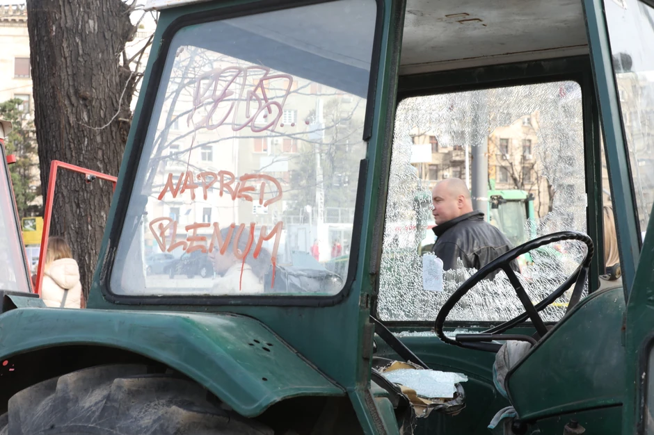 On je priznao da je 15. marta između 19 i 20 časova za vreme održavanja prijavljenog javnog okupljanja na prostoru između Doma Narodne skupštine i zgrade Predsedništva Republike Srbije došao do traktora koji je bio parkiran u blizini Pionirskog parka pa je rukama vukao retrovizor traktora u nameri da ga polomi i rukama lomio delove parkiranih traktora.