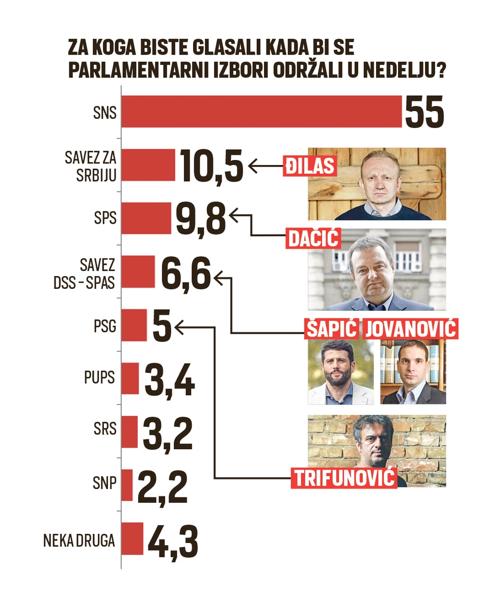 Prema poslednjem istraživanju koje je agencija "Faktor plus" uradila u saradnji sa "Blicom" od 30. aprila do 8. maja, naprednjaci bi na parlamentarnim izborima osvojili 55 procenata glasova. Nema velike razlike ni u rejtinzima ostalih političkih organizacija. Savez za Srbiju osvojio bi 10,5 odsto, Socijalistička partija Srbije 9,8 procenata, a Pokret slobodnih građana pet. Vladimir Pejić iz agencije "Faktor plus" kaže za naš list da nije ni realno očekivati veće promene na mesečnom nivou.