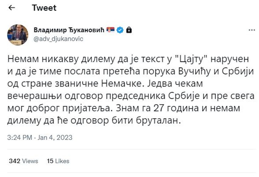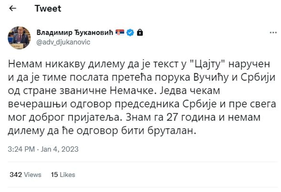 - Nemam nikakvu dilemu da je tekst u "Cajtu" naručen i da je time poslata preteća poruka Vučiću i Srbiji od strane zvanične Nemačke. Jedva čekam večerašnji odgovor predsednika Srbije i pre svega mog dobrog prijatelja. Znam ga 27 godina i nemam dilemu da će odgovor biti brutalan - napisao je Đukanović na Tviteru.