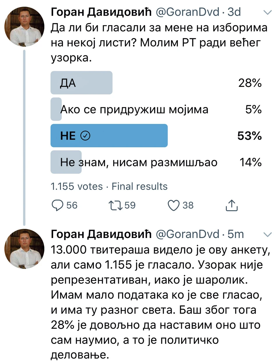 "Ukupno je 13.000 tviteraša videlo ovu anketu, ali je glasalo samo 1.155. Uzorak nije reprezentativan, iako je šarolik. Imamo malo podataka ko je sve glasao i ima tu raznog sveta. Baš zbog toga, 28 odsto je dovoljno da nastavim ono što sam naumio, a to je političko delovanje", napisao je Davidović.