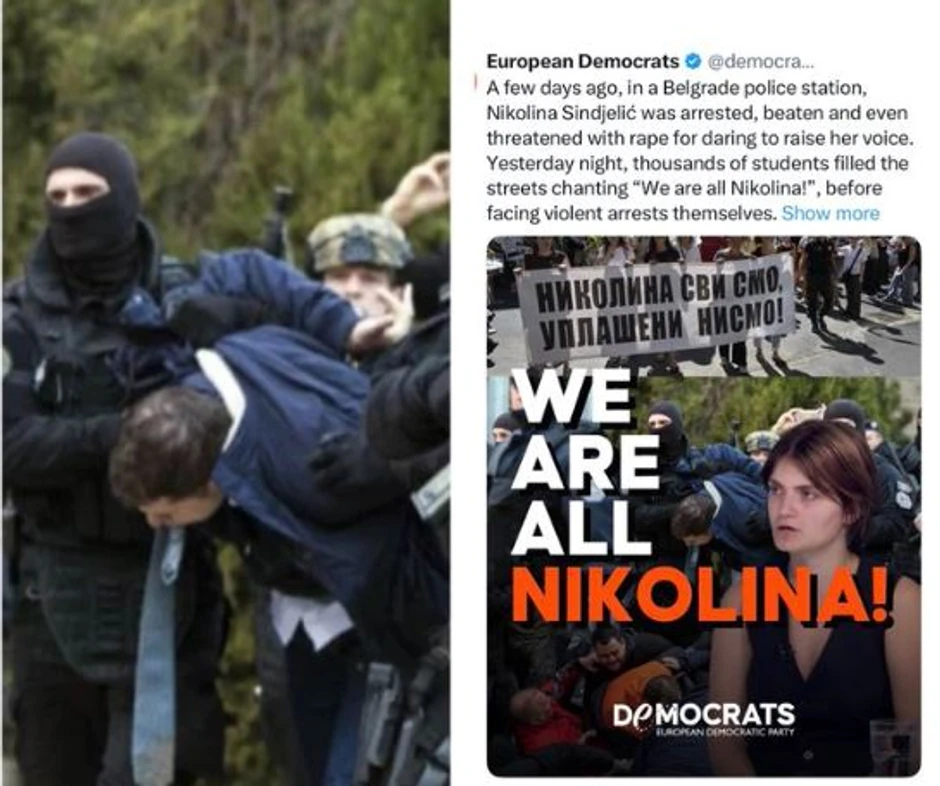 Evropske demokrate objavile su sliku hapšenja Marka Ðurića na Kosovu uz poruku podrške studentkinji Nikolini Sinđelić, koja se žalila na postupanje policijskih službenika tokom protesta u subotu uveče. Ministar spoljnih poslova je reagovao i poručio da "jedva čeka da vidi šta je sledeće."