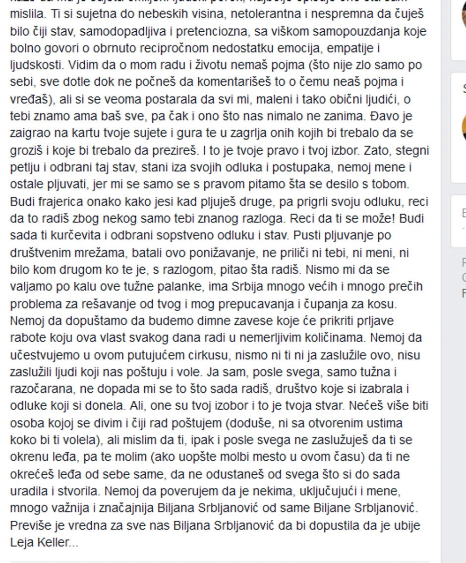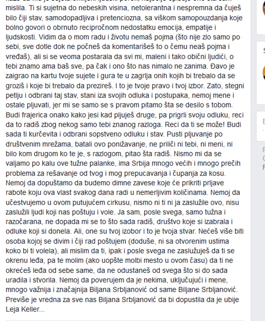 - Budi sada ti ***čevita i odbrani sopstveno odluku i stav. Pusti pljuvanje po društvenim mrežama, batali ovo ponižavanje, ne priliči ni tebi, ni meni, ni bilo kom drugom ko te je, s razlogom, pitao šta radiš....Nećeš više biti osoba kojoj se divim i čiji rad poštujem (doduše, ni sa otvorenim ustima koko bi ti volela), ali mislim da ti, ipak i posle svega ne zaslužuješ da ti se okrenu leđa, pa te molim (ako uopšte molbi mesto u ovom času) da ti ne okrećeš leđa od sebe same, da ne odustaneš od svega što si do sada uradila i stvorila. Nemoj da poverujem da je nekima, uključujući i mene, mnogo važnija i značajnija Biljana Srbljanović od same Biljane Srbljanović. Previše je vredna za sve nas Biljana Srbljanović da bi dopustila da je ubije Leja Keller... - zaključila je Ćorović.