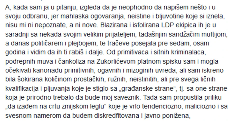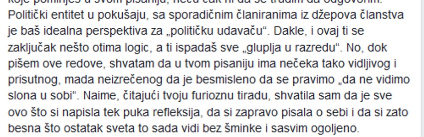 - U gomili bljuvotina i laži koje si iznela o meni, falilo je samo još da napišeš da sam **rvetina, jer je i to "argument" koji tvoji pajtosi pokušavaju da okače na moj život. Tvoje pismo je, u svakoj napisanoj, ali i nenapisanoj reči opozit od onoga za šta sam bila uverena da je deo vrednosnog sistema ženske solidarnosti i feminističke teorije - piše u ovom postu.