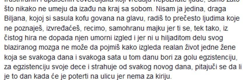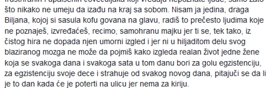 Kaže i da nije ona jedina "draga Biljana, kojoj si sasula kofu **vana na glavu, radiš to prečesto ljudima koje ne poznaješ, izvređaćeš, recimo, samohranu majku jer ti se, tek tako, iz čistog hira ne dopada njen umorni izgled, i jer ni u hiljaditom delu svog blaziranog mozga ne može da pojmiš kako izgleda realan život jedne žene koja se svakoga dana i svakoga sata u tom danu bori za golu egzistenciju, za egzistenciju svoje dece i strahuje od svakog novog dana, pitajuči se da li je to dan kada će je poterti na ulicu jer nema za kiriju".