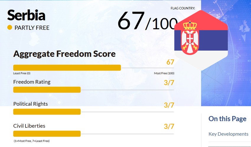 Najnoviji godišnji izveštaju organizacije "Fridom Haus" (FH) o slobodama koji obuhvata 195 zemalja, pokazao je da je Srbija nazadovala i, praktično, iz grupe slobodnih zemalja prešla u grupu delimično slobodnih.