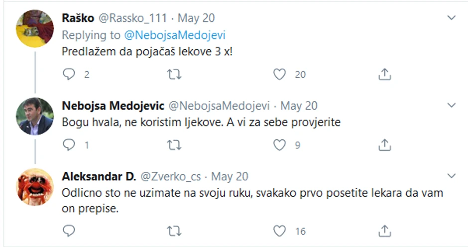 Drugi tviteraš mu je preporučio da "pojača lekove 3x", a treći da poseti lekara kako bi mu ih on prepisao.