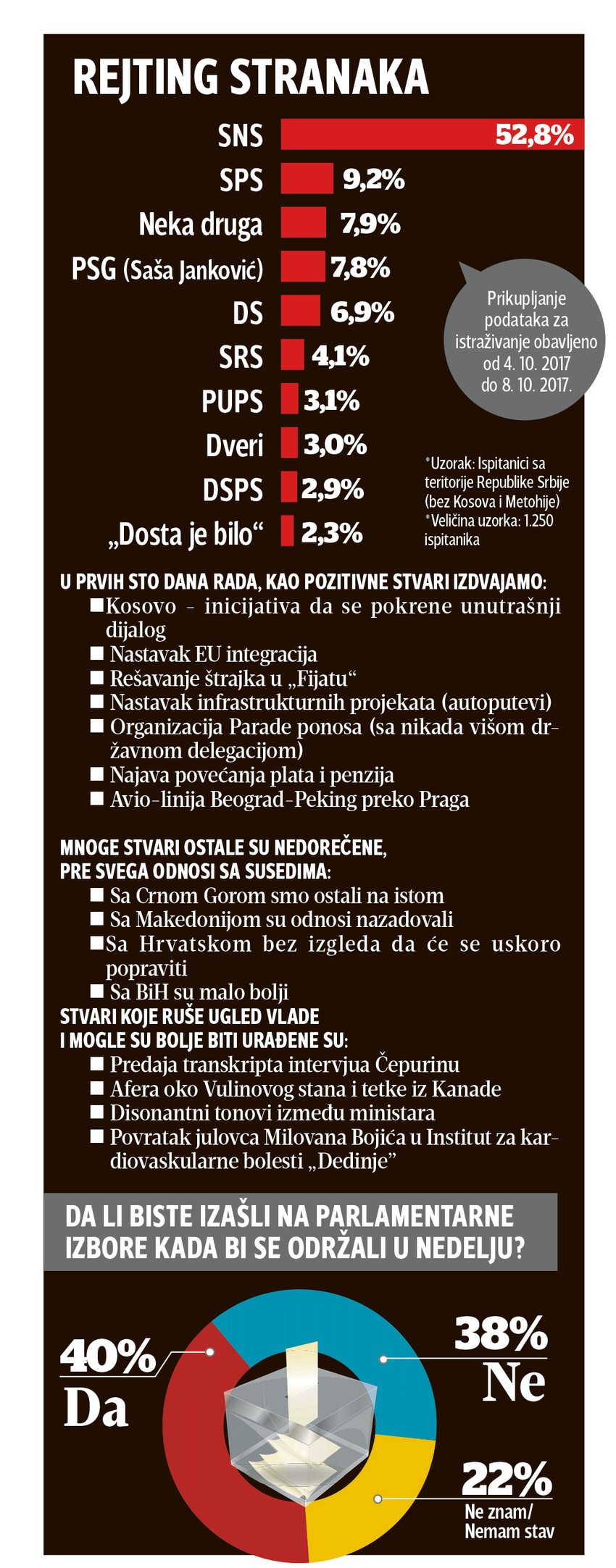Kada je reč o rejtingu stranaka, Srpska napredna stranka ima podršku 52,8 procenata ispitanika i na tom nivou naprednjaci su već dugo. Na drugom mestu je Socijalistička partija Srbije sa podrškom od 9,2 odsto.