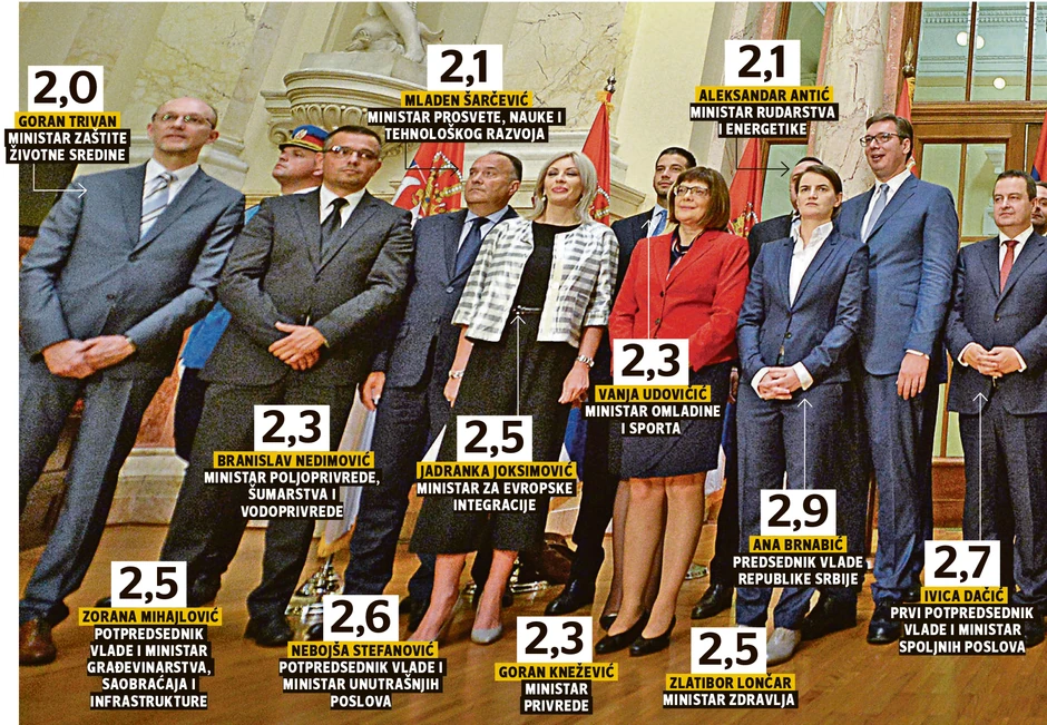Prema istraživanju koje je rađeno od 4. do 8. oktobra na 1.250 ispitanika, najvišu ocenu zaslužila je predsednica Vlade Ana Brnabić, koja je dobila 2,9, a najgoru ministri odbrane i životne sredine Aleksandar Vulin i Goran Trivan.