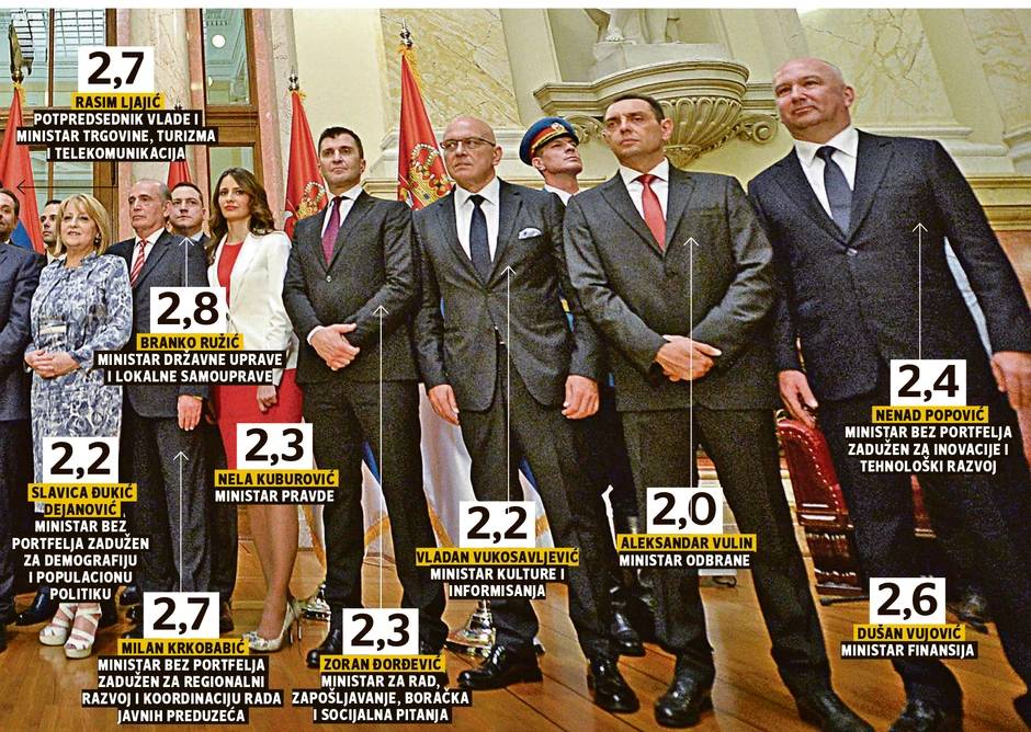 Posle premijerke, najbolje ocenjen je ministar državne uprave Branko Ružić sa ocenom 2,8, kao i ministar spoljnih poslova Ivica Dačić sa ocenom 2,7, koji je uvek među najbolje rangiranima, „što zbog toga što je lider stranke, što zbog dobrih odnosa sa SNS-on, što zbog ličnog šarma”. Više ocene dobili su i ministar trgovine Rasim Ljajić, ministar finansija Dušan Vujović i ministar unutrašnjih poslova Nebojša Stefanović.