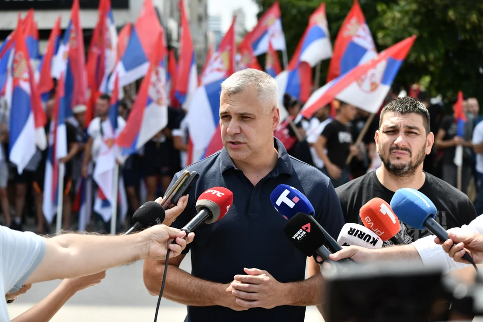Većina okupljenih nosi srpske zastave i majice sa srpskim obeležjima.