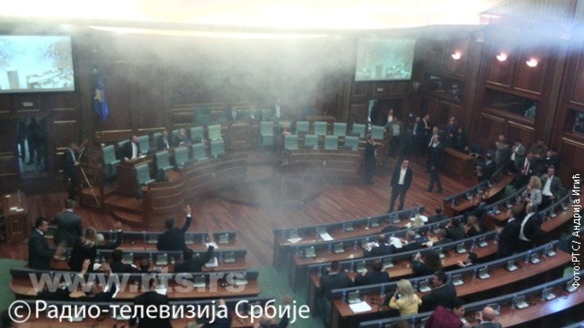 Pre bacanja suzavca došlo je do koškanja između poslanika opozicije i vladajuće koalicije i u jednom trenutku poslanica Samopredeljenja Aljbuljena Hadžiju bacila je punu čašu vode u lice potpredsedniku Skupštine Kosova Džavid Haljitiju.