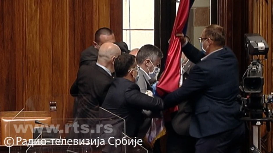Dok ga je obezbeđenje izbacivalo, Obradović se uhvatio za zastavu koja je postavljena u sali, i sa njom je i izvučen napolje.