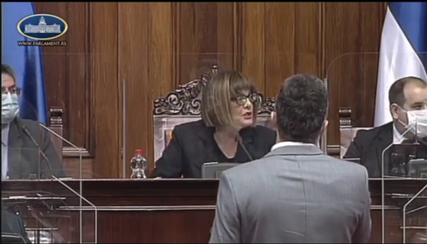 Samo nekoliko minuta od početka sednice, Obradović je u salu ušao sa pištaljkom, u koju je zviždao u znak protesta. Zbog toga je predsednica parlamenta odredila pauzu od 10 minuta, i naložila isključenje Obradovića iz sale.