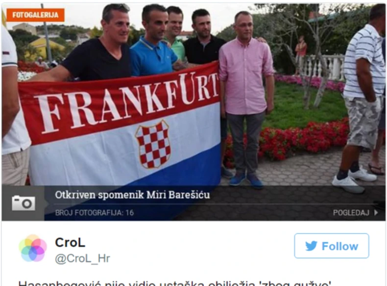 Ministar kulture Hrvatske Zlatko Hasanbegović ponovo je fotografisan sa ustaškim simbolima - ovaj put na otkrivanju spomenika teroristi Miri Barešiću u Dragama, kraj Pakoštana, slikao se grupom koje je držala zastavu sa ustaškom ikonografijom.