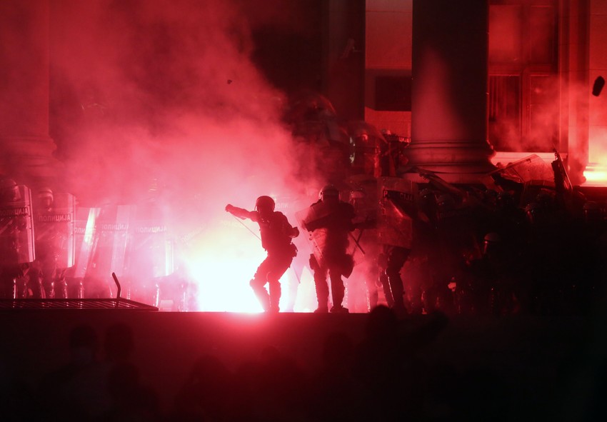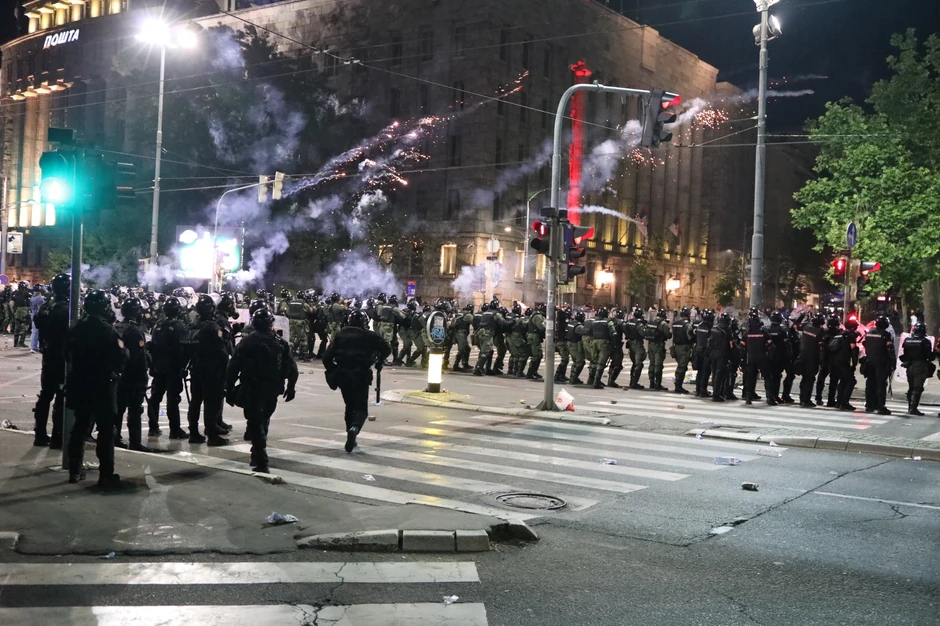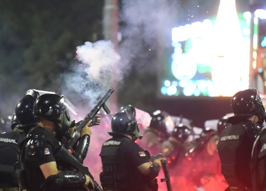 Na uglu Takovske i Bulevara kralja Aleksandra Žandarmerija potiskuje demonstrante ka Crkvi Svetog Marka. Ipaljen je i novi suzavac.