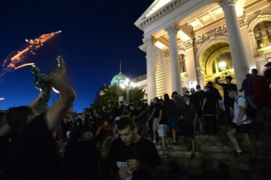 Huligani su probili zaštitnu ogradu i popeli se na skupštinsko stepenište, a zatim i upali u zgradu Narodne Skupštine.