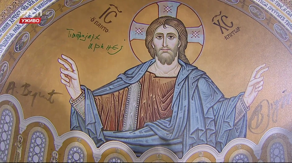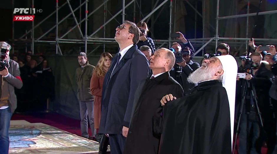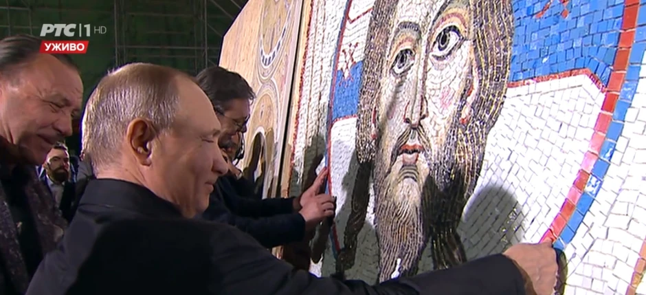 Oni su utisnuli po tri kockice u trobojku - Putin rusku, a patrijarh Irinej i Vučić srpsku - na mozaiku koji će se naći na zidu Hrama Svetog Save, a tim gestom duboke simbolike i zvanično će početi druga faza radova na uređenju enterijera ove crkve. Patrijarh, Putin i Vučić su se potom potpisali na maketu mozaika.
