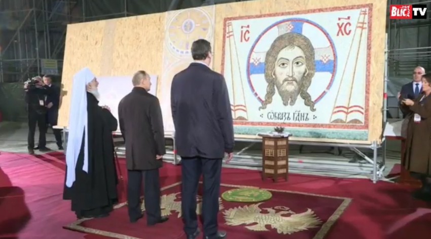 Patrijarh Irinej, Vučić i Putin simbolično ugradili delove ruske i srpske trobojke na mozaiku sa likom Hrista na kojem rade ruski umetnici.