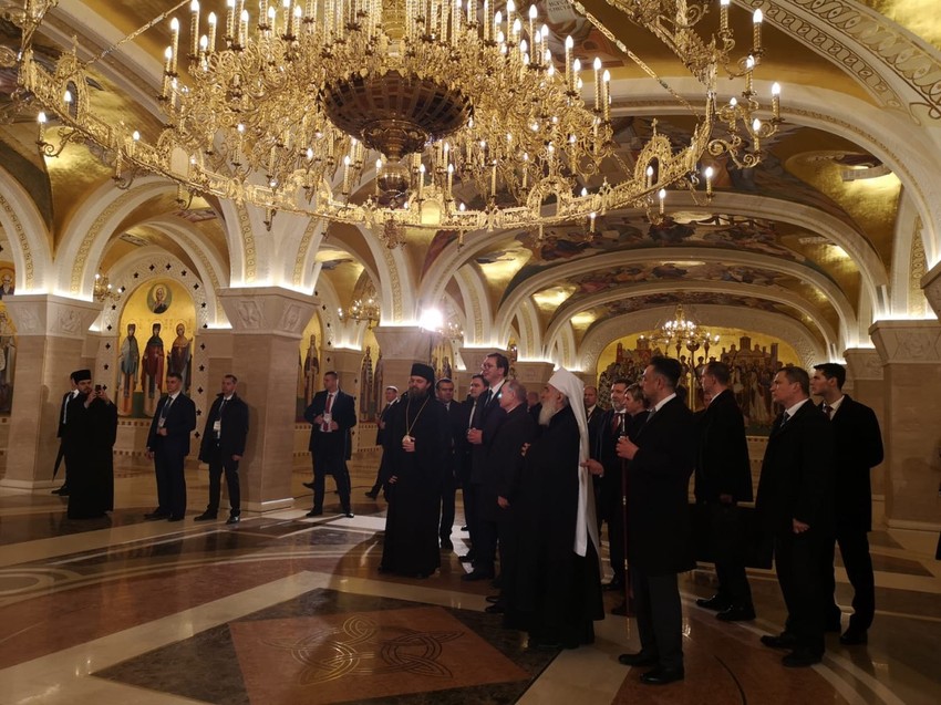 Putin i Vučić su prethodno obišli kriptu u hramu, gde su u pratnji patrijarha Irineja i starešine hrama, vladike Stefana, upalili sveće, a potom obišli ostali deo hrama kako bi se upoznali šta je sve urađeno u njemu od 2011. godine.