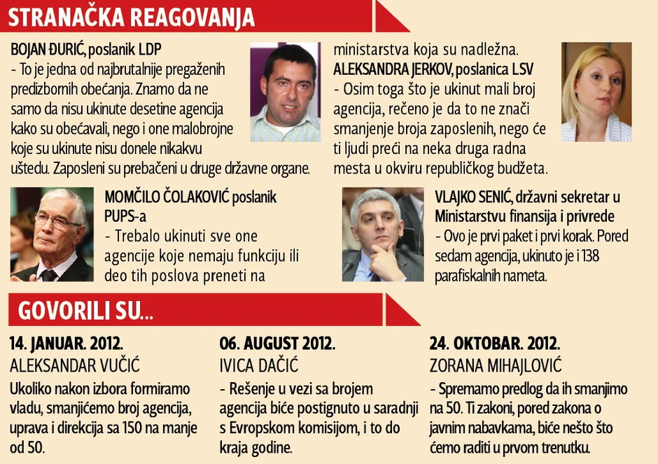 U predizbornoj kampanji najavljivano je da će biti ukinuto čak sto agencija, da bi se konstituisanjem vlasti taj broj sveo na 60. Zatim je Ministarstvo finansija i privrede napravilo spisak za ukidanje od samo dvadesetak, da bi na kraju u parlamentu bilo izglasano gašenje samo sedam takvih tela.