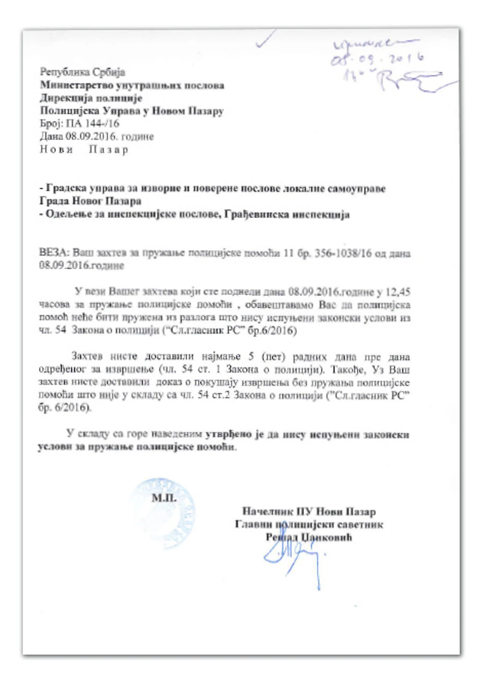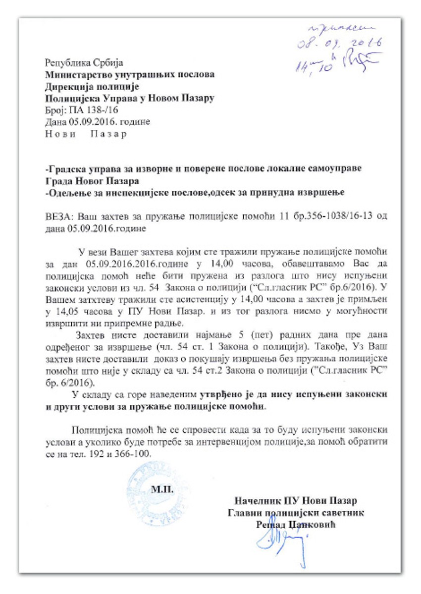 U jednom od dopisa, 16. septembra ove godine, policija konstatuje: