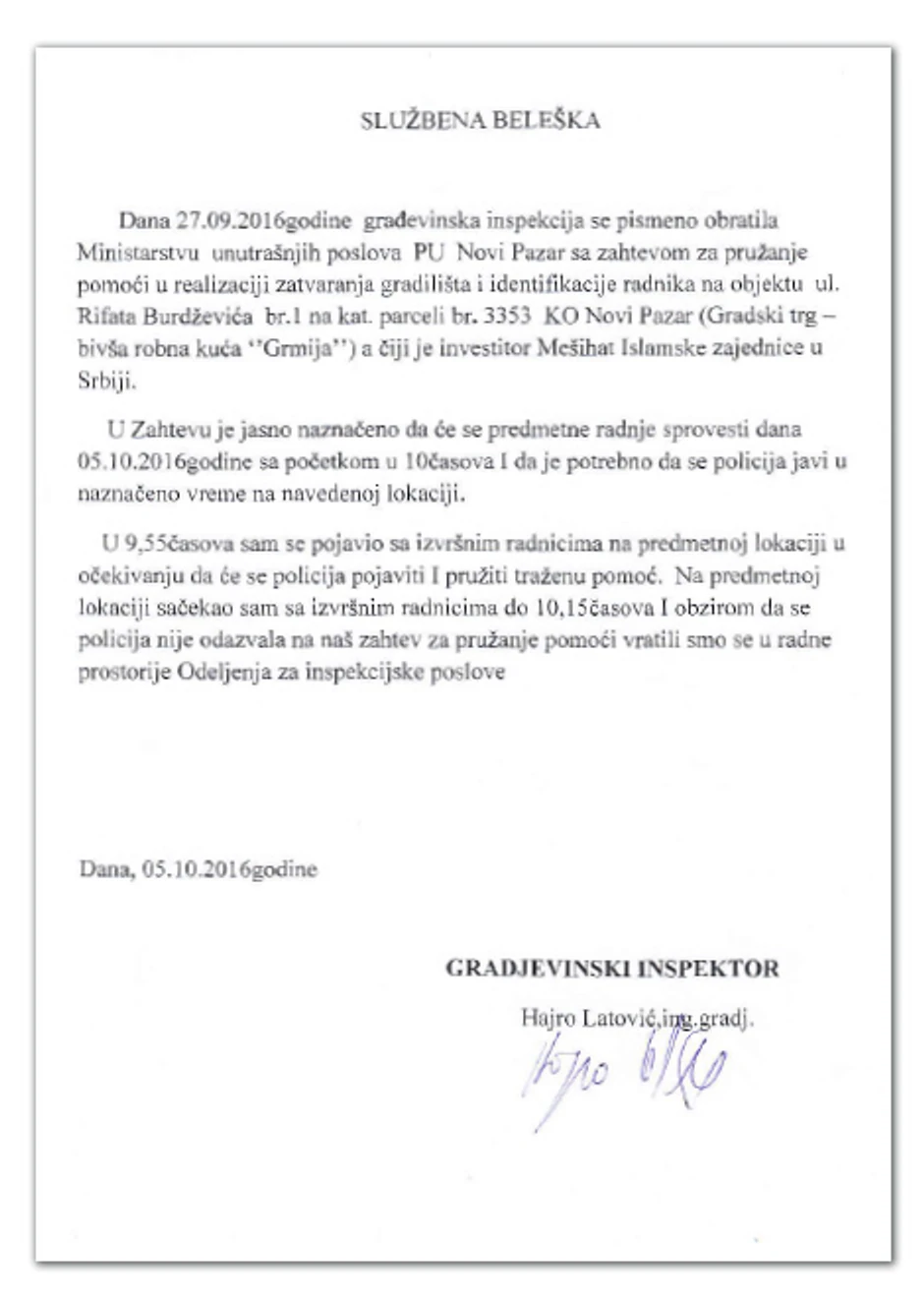 A kao konačan dokaz nemoći države, iako se građevinska inspekcija svakodnevno obraćala policiji za asistenciju u zatvaranju gradilišta (pogledajte dopise u prilogu, a "Blic" ih poseduje još nekoliko desetina), pripadnici MUP-a nijednom se nisu odazvali navodeći najrazličitije razloge.