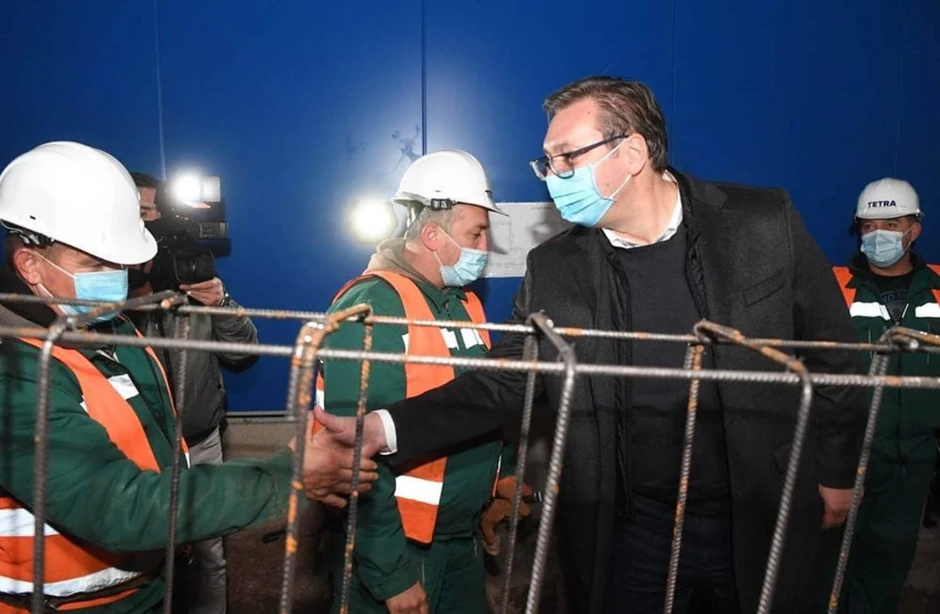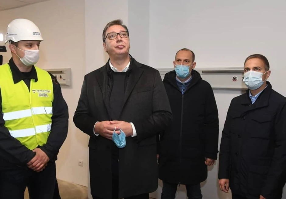 Predsednik Srbije Aleksandar Vučić obišao je radnike u trećoj smeni i radove na izgradnji nove kovid bolnice u Vojnom kompleksu "Zemun ekonomija" na Batajničkom drumu u Beogradu.