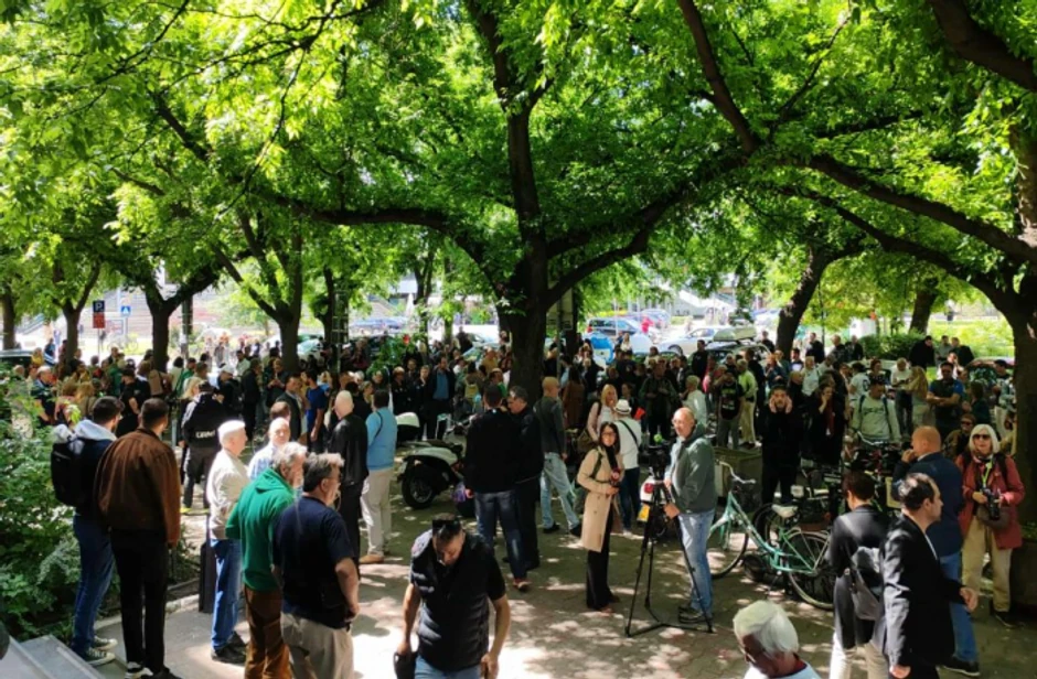 Okupljeni građani, studenti i stranački aktivisti nose transparente i antifašističke zastave. Takođe, prave buku pištaljkama, vuvuzelama i sirenama.