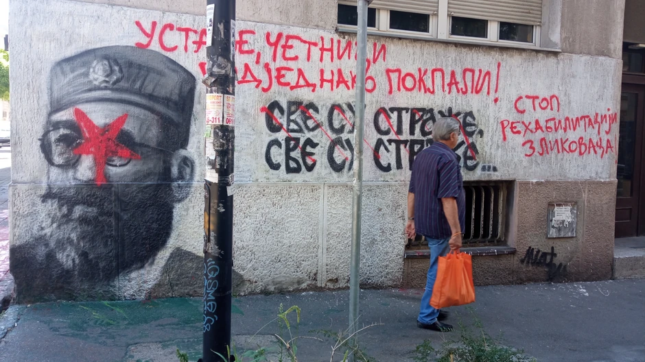 Mural komandantu Jugoslovenske vojske u otadžbini, generalu Dragoljubu Draži Mihailoviću, u centru Beograda, osvanuo je jutros iškraban crvenom bojom i porukama "Ustaše, četnici, podjednako poklali" i "Stop rehabilitaciji zlikovaca".