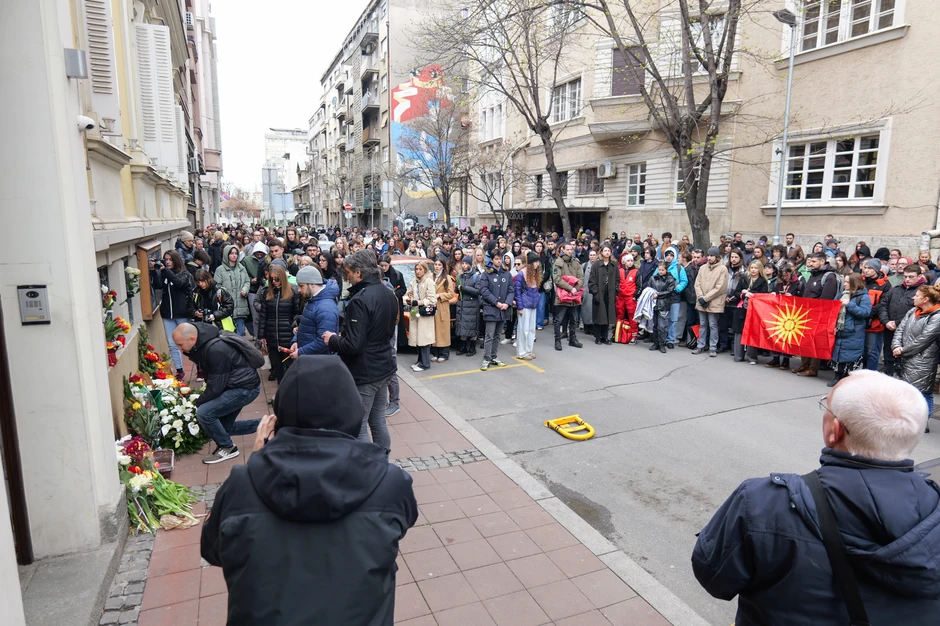Studeni polažu vence i pale sveće ispred ambasade, a pridružili su im se i građani koji takođe ostavljaju cveće i upaljene sveće. Diplomate Severne Makedonije izašle su da pozdrave okupljene studente i građane.