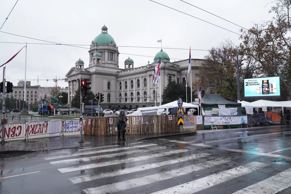 U blizini parlamenta, na raskrsnici Takovske i Bulevara kralja Aleksandra, nalazi se šator u kojem je Dijana Hrka, čiji je sin nastradao u padu nadstrešnice na Železničkoj stanici u Novom Sadu, a koja od nedelje, 2. novembra, štrajkuje glađu, dok je sa njom i manja grupa građana koji joj pružaju podršku.