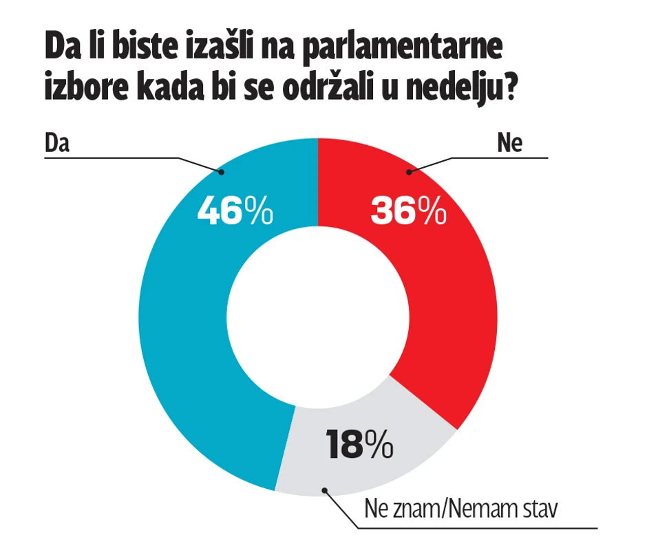 Da se izbori održavaju u nedelju, na njih bi izašlo 46 odsto građana, 36 procenata ne bi, dok 18 odsto ne zna ili nema stav.