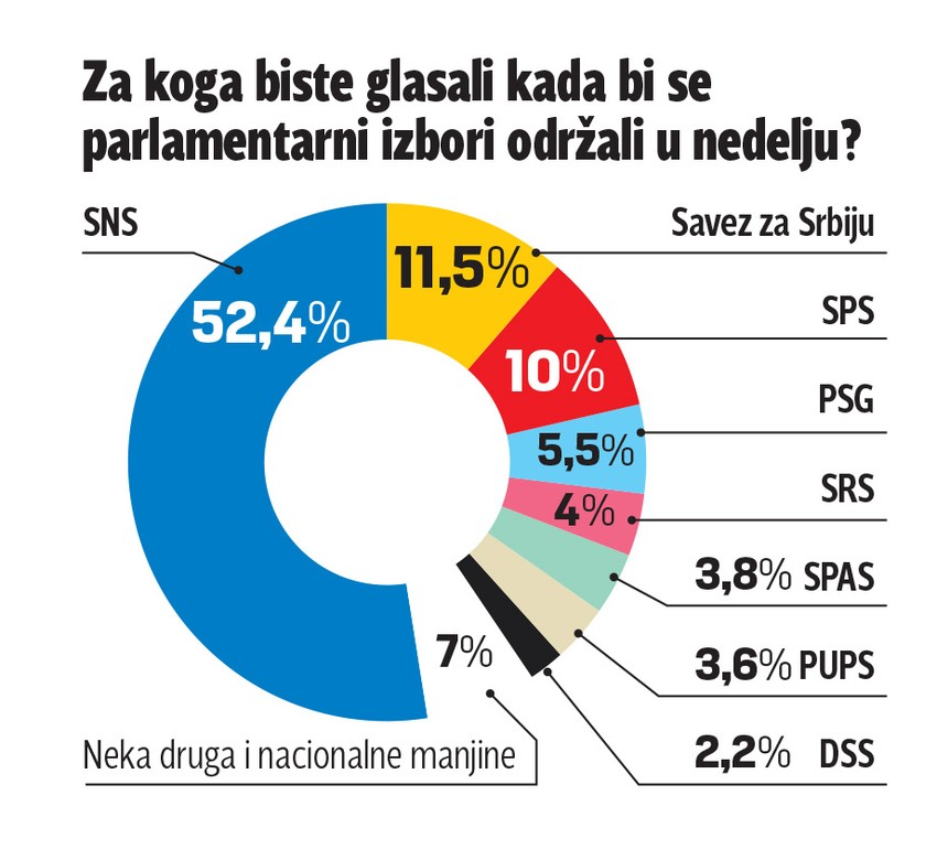 Naprednjaci bi, prema istraživanju javnog mnjenja, osvojili 52,4 odsto glasova, što je gotovo isto kao i prethodnog meseca. Savez za Srbiju, u slučaju kada bi nastupio u sadašnjem sastavu i kada bi izašao na izbore, osvojio bi 11,5 procenata, a Socijalistička partija Srbije imala bi 10 odsto podrške. Pored pomenute trojke, cenzus bi izvesno prešao i Pokret slobodnih građana Sergeja Trifunovića (5,5 odsto).